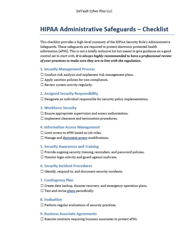 This checklist provides a high-level summary of the HIPAA Security Rule’s Administrative Safeguards. These safeguards are required to protect electronic protected health information (ePHI). This is not a totally inclusive list but meant to give guidance on a good control set to start with. It is always highly recommended to have a professional review of your practices to make sure they are in line with the regulation.